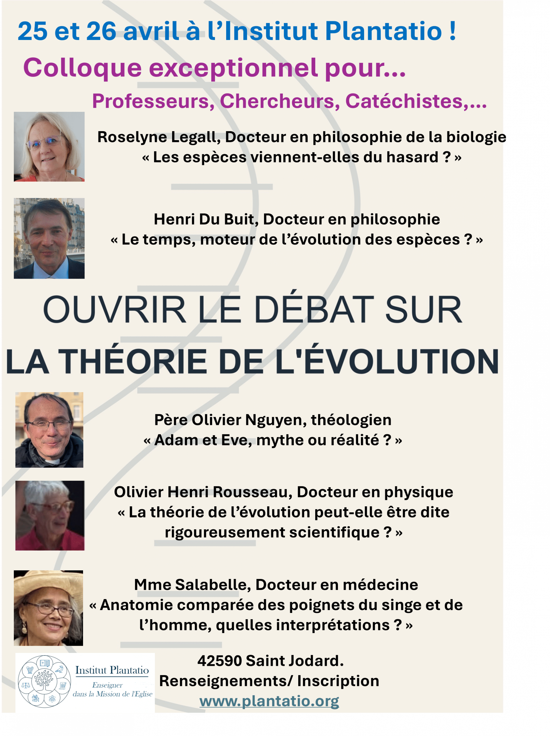 Ce colloque est à destination particulièrement d’enseignants chrétiens en biologie désireux d’avoir des ressources intellectuelles sur ce sujet. Il rassemble d’une manière exceptionnelle des universitaires à la fois spécialistes du sujet mais aussi capables de l’aborder d’une manière transdisciplinaire. Il comportera également des temps de prière et d’échanges fraternels. Il est aussi destiné à ceux qui sont impliqués dans la catéchèse ou qui ont des responsabilités dans l’enseignement. Il est aussi ouvert à ceux qui ont un intérêt particulier sur ce sujet.